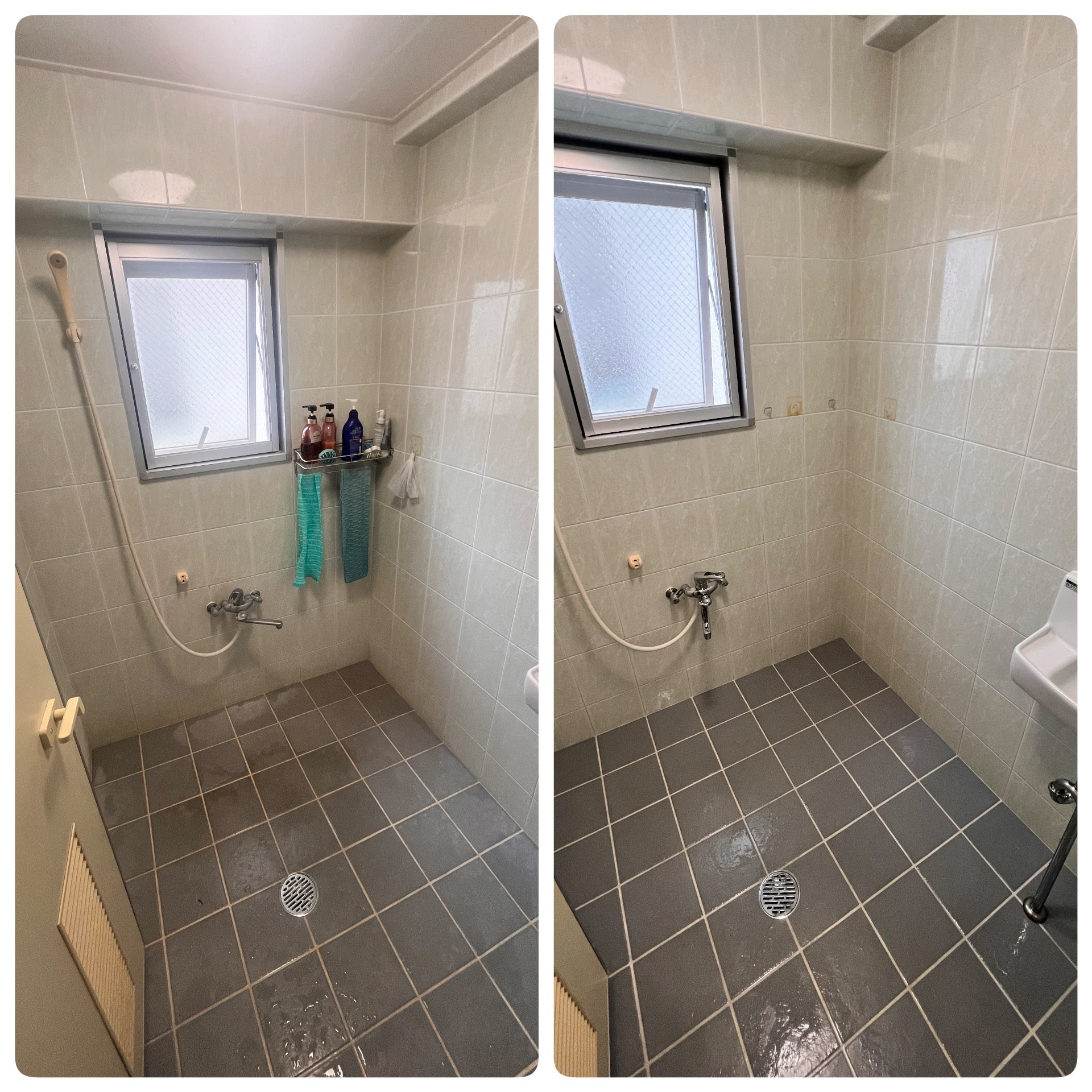 浴室清掃の依頼と頂き対応させて頂きました。タイル貼りで浴槽無しのタイプです。タイルに付着していた石鹸カスの除去がメインでした。固くなった石鹸カスはまず柔らかくするため薬剤による付け置きなどが必要となります。普段の掃除ではなかなか落ちない汚れが気になるという方、ぜひハウスクリーニング Re:roomにお声がけください!